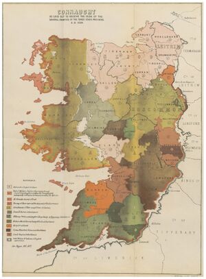 خريطة للأراضي الواقعة غرب نهر شانون المخصصة للأيرلنديين الأصليين بعد طردهم من أراضيهم بموجب قانون تسوية أيرلندا 1652. لاحظ أنه تم "تطهير جميع الجزر البحرية من الأيرلنديين" واحتجاز حزام بعرض ميل واحد حول الساحل للمستوطنين الإنگليز.
