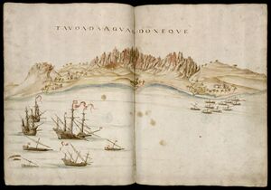 News of the Portuguese conquest of Oman had sown considerable distress within the city, and rumour had spread that the Portuguese even devoured people.[16] Likely for this reason, Albuquerque was greeted by no emissaries, with whom he could engage in diplomatic relations. In such case, he summoned the captain of the largest vessel in the harbor – an 800 tons Gujarati trade ship – to his ship instead, to act as a conveyor of his intentions to the sovereign of Hormuz. He declared to have come with orders from King Manuel of Portugal to vassalize Hormuz and take it under his protection, but he offered the city the chance to capitulate bloodlessly.[17]