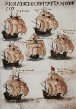 13. ^ أ ب Elbl, Martin (1994). "The Caravel and the Galleon". In Gardiner, Robert; Unger, Richard W (eds.). Cogs, Caravels and Galleons : the sailing ship, 1000-1650. London: Conway Maritime Press. ISBN 0851775608.