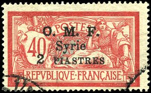 في يوليو 1920، خلع الفرنسيون الملك فيصل عن عرشهم ومنحت عصبة الأمم انتدابًا لفرنسا على كل سوريا من عام 1923. بعد منح الانتداب و بعد هزيمة القوات السورية في مايو 1920، تعرضت سوريا للاحتلال العسكري الفرنسي. انقسمت سوريا بين منطقة ساحلية عاصمتها بيروت، والتي أصبحت فيما بعد لبنان، والداخلية تحت سيطرة العرب وعاصمتها دمشق. تم استخدام طوابع فرنسا بين عامي 1920 و 1922 مطبوع عليها T.E.O. (الأراضي المحتلة Ennemis) أو O.M.F. (الاحتلال الفرنسي العسكري).[1]