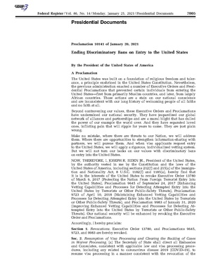 في 20 يناير 2021، أوقف بايدن بناء الحاجز بين الولايات المتحدة والمكسيك[22] وانتهت حالة الطوارئ الوطنية المتعلقة بالحدود الجنوبية للولايات المتحدة التي تم إعلانها في فبراير 2018.[23]أصدر بايدن إعلانًا أنهى حظر سفر ترامب الذي فرضه دونالد ترامب على الدول ذات الأغلبية المسلمة في يناير 2017.[22][23] كما أكد بايدن مجددًا على الحماية لمتلقي الإجراءات المؤجلة للقادمين من الأطفال.[64] في اليوم نفسه، أرسل بايدن مذكرة إلى وزارة الخارجية لإعادة تأجيل المغادرة القسرية (DED) لليبيريين.[65][66]