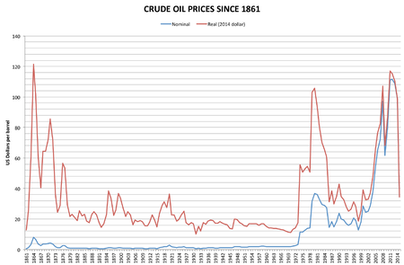 ارتفع سعر النفط بشكل مبلغ فيه من 50 دولار أمريكي في بداية 2007 إلى 147 دولار في يوليو 2008 قبل سقوطه إلى 34 دولار في ديسمبر 2008، في ظل الأزمة المالية 2007–2008.[3]