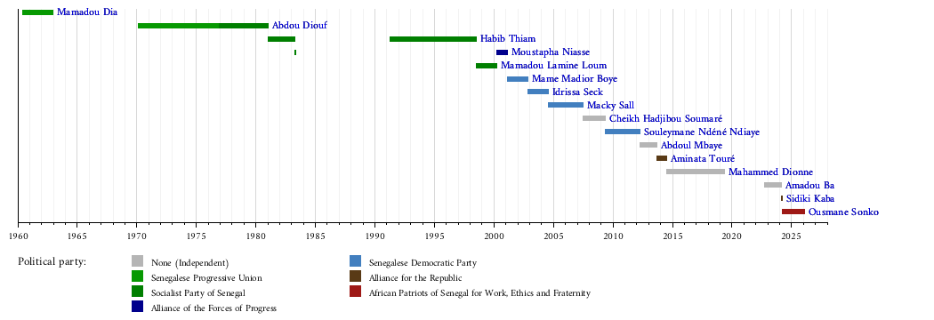26 فبراير 1970 | 31 ديسمبر 1980 | 10 years, 309 days | الحزب الاشتراكي | ليوپولد سيدار سنگور | |