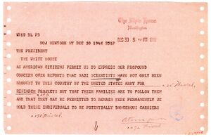 In a secret directive circulated on September 3, 1946, President Truman officially approved Operation Paperclip and expanded it to include 1,000 German scientists under "temporary, limited military custody".[8][9][10] News media revealed the program as early as December 1946.[11]