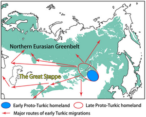 There is general agreement among linguists and historians that Proto-Turkic was spoken somewhere in Central-East Asia.[3] Its most likely ultimate homeland was modern-day Eastern Mongolia.[4] From circa 1200 BCE, nomadic activity led to the expansion of Proto-Turkic into a wider area, from the Sayan-Altai Mountains in South Siberia, to Eastern Inner Mongolia.[3] Proto-Turkic is thought to have split at the end of the first millennium BCE.[3]