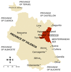 خريطة مقاطعة بلنسية والبلدات الرئيسية التابعة لها.