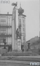 On 11–14 September 1939, during the invasion of Poland, which started World War II, the German and Polish armies fought the Battle of Przemyśl in and around the city. Afterwards the battle German Einsatzgruppe I entered the city to commit various atrocities against the population, and the Einsatzgruppe zbV entered to take over the Polish industry.[15] The battle was followed by three days of massacres carried out by the German soldiers, police and Einsatzgruppe I against hundreds of Jews who lived in the city. In total, over 500 Jews were murdered in and around the city and the vast majority of the city's Jewish population was deported across the San River into the portion of Poland that was occupied by the Soviet Union.[16]