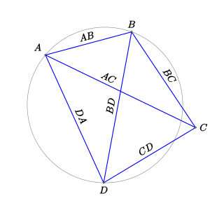 The four points can be ordered in any of three distinct ways (counting reversals as not distinct) to form three different quadrilaterals, for each of which the sum of the products of opposite sides is at least as large as the product of the diagonals. Thus the three product terms in the inequality can be additively permuted to put any one of them on the right side of the inequality, so the three products of opposite sides or of diagonals of any one of the quadrilaterals must obey the triangle inequality.[1]