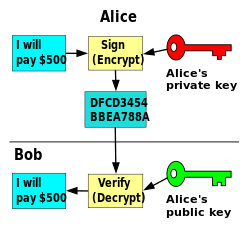 - التوقيع الرقمي: يمكن التحقق من رسالة موقعة بالمفتاح الخاص للمرسل بواسطة أي شخص لديه حق الوصول إلى المفتاح المعلن للمرسل، وبالتالي إثبات أن المرسل لديه حق الوصول إلى المفتاح الخاص (وبالتالي من المحتمل أن يكون الشخص المرتبط بالمفتاح المعلن المستخدم)، والجزء الذي لم يتم العبث به من الرسالة. فيما يتعلق بمسألة المصادقة، انظر أيضاً ملخص الرسالة.