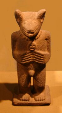 Pre-Columbian coyote statuette attributed to the Purepecha culture,[11] likely a representation of the coyote god Uitzimángari.[12] Height: 43.5 cm (17 in).