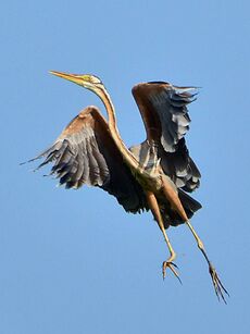 The purple heron inhabits marshes, lagoons and lakes surrounded by dense vegetation. It may frequent mangrove swamps on the coast but it usually chooses freshwater habitats, particularly locations with reed beds (Phragmites). It also visits mudflats, river banks, ditches and canals.[6] In the Cape Verde Islands, it is more likely to be seen in the open, on arid slopes.[9]