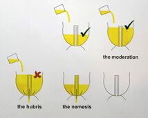 A Pythagorean cup (also known as a Pythagoras cup, greedy cup, cup of justice, anti greedy goblet or Tantalus cup) is a practical joke device in a form of a drinking cup. When it is filled beyond a certain point, a siphoning effect causes the cup to drain its entire contents through the base. The cup has been used to make statements about greed.