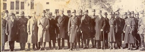صولةالدولة قشقائي (واقفاً الخامس من اليسار مرتدياً قبعة بهلوية) في منفاه في طهران (فبراير 1920) إلى جانب مجموعة من الشخصيات البهلوية البارزةThe yearly migrations of the Kashkai, seeking fresh pastures, drive them from the south to the north, where they move to their summer quarters "Yailaq" in the high mountains; and from the north to the south, to their winter quarters, "Qishlaq". In summer, the Kashkai flocks graze on the slopes of the Kuh-è-Dinar; a group of mountains from 12,000 to 15,000 feet, that are part of the Zagros chain. In autumn the Kashkai break camp, and by stages leave the highlands. They winter in the warmer regions near Firuzabad, Kazerun, Jerrè, Farashband, on the banks of the river Mound, till, in April, they start once more on their yearly trek. The migration is organised and controlled by the Kashkai Chief. The Tribes carefully avoid villages and towns such as Shiraz and Isfahan, lest their flocks, estimated at seven million head, might cause serious damage. The annual migration is the largest of any Persian tribe.