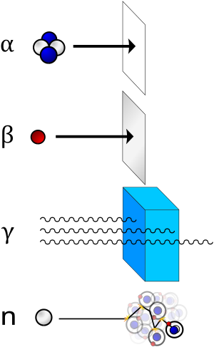 - Beta particles (electrons) are more penetrating, but still can be absorbed by a few millimetres of aluminium. However, in cases where high-energy beta particles are emitted, shielding must be accomplished with low atomic weight materials, e.g. plastic, wood, water, or acrylic glass (Plexiglas, Lucite).[21] This is to reduce generation of Bremsstrahlung X-rays. In the case of beta+ radiation (positrons), the gamma radiation from the electron–positron annihilation reaction poses additional concern.