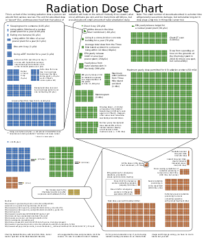 The public information dose chart of the USA Department of Energy, shown here on the right, applies to USA regulation, which is based on ICRP recommendations. Note that examples in lines 1 to 4 have a scale of dose rate (radiation per unit time), whilst 5 and 6 have a scale of total accumulated dose.