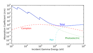 In a typical graded-Z shield, the high-Z layer effectively scatters protons and electrons. It also absorbs gamma rays, which produces X-ray fluorescence. Each subsequent layer absorbs the X-ray fluorescence of the previous material, eventually reducing the energy to a suitable level. Each decrease in energy produces Bremsstrahlung and Auger electrons, which are below the detector's energy threshold. Some designs also include an outer layer of aluminium, which may simply be the skin of the satellite. The effectiveness of a material as a biological shield is related to its cross-section for scattering and absorption, and to a first approximation is proportional to the total mass of material per unit area interposed along the line of sight between the radiation source and the region to be protected. Hence, shielding strength or "thickness" is conventionally measured in units of g/cm2. The radiation that manages to get through falls exponentially with the thickness of the shield. In x-ray facilities, walls surrounding the room with the x-ray generator may contain lead shielding such as lead sheets, or the plaster may contain barium sulfate. Operators view the target through a leaded glass screen, or if they must remain in the same room as the target, wear lead aprons.