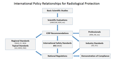 The ICRP's recommendations flow down to national and regional regulators, which have the opportunity to incorporate them into their own law; this process is shown in the accompanying block diagram. In most countries a national regulatory authority works towards ensuring a secure radiation environment in society by setting dose limitation requirements that are generally based on the recommendations of the ICRP.