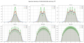 Spectral density of GOE/GUE/GSE, as . They are normalized so that the distributions converge to the semicircle distribution. The number of "humps" is equal to N.