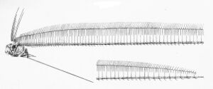 The organs of the giant oarfish are concentrated toward the head end of the body, possibly enabling it to survive losing large portions of its tail.[14] It has no swim bladder. The liver of R. glesne is orange or red, the likely result of astaxanthin in its diet.[15] The lateral line begins above and behind the eye then, descending to the lower third of the body, extends to the caudal tip.[16]