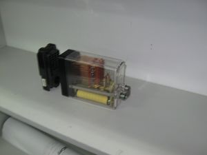 • المفتاح: ويتخذ وضعان، الوضع الطبيعي غير ملامس، ووضع التوصيل، الملامس. عند مرور التيار الثابت في الملف، يبدأ المغناطيس الكهربائي بالعمل فينجذب الذراع المعدني إلى الأسفل وتكتمل الدائرة فيبدأ التيار في السريان إلى الدائرة.