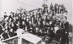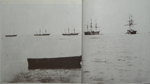 Shortly before midnight on 4 October, the ships left the port of Shinagawa in Tokyo Bay.[3] Enomoto's fleet consisted of four warships (Kaiyō maru (flagship), Kaiten maru, Banryū maru and Chiyodagata maru) and four transport ships (Kanrin maru, Shinsoku maru, Chōgei maru and Mikaho maru).[4]