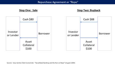 According to Yale economist Gary Gorton, repo evolved to provide large non-depository financial institutions with a method of secured lending analogous to the depository insurance provided by the government in traditional banking, with the collateral acting as the guarantee for the investor.[4]