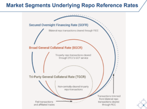 The New York Times reported in September 2019 that an estimated $1 trillion per day in collateral value is transacted in the U.S. repo markets.[2] The Federal Reserve Bank of New York reports daily repo collateral volume for different types of repo arrangements. As of 24 October 2019, volumes were: secured overnight financing rate (SOFR) $1,086 billion; broad general collateral rate (BGCR) $453 billion, and tri-party general collateral rate (TGCR) $425 billion.[3] These figures however, are not additive, as the latter 2 are merely components of the former, SOFR.[13]
