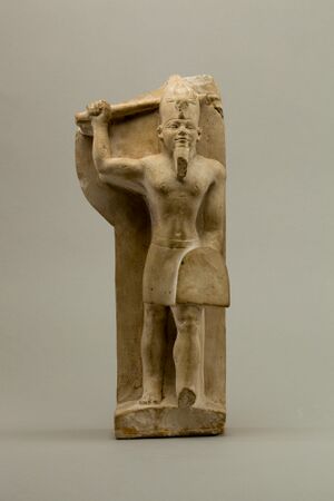 Christiane Zivie-Coche notes that as in the case of other foreign deities incorporated into the Egyptian pantheon, Resheph’s Egyptian iconography was primarily meant to illustrate his functions, rather than his place of origin.[6] However, it has been argued that the kilt with tassels he was usually depicted in marked him as a foreign deity.[129] He was often portrayed as a so-called “menacing god”, with one arm raised above head and brandishing a weapon.[130] His attributes include a shield, a bow and arrows.[6] Despite his character, he was never depicted attacking enemies, and seemingly art highlighted his protective aspect.[131] Sometimes a lute could serve as one of his symbols.[132] One example of a stele depicting him with this instrument on his back, presumed to originate in Hurbeit, has been identified in the collection of the Roemer- und Pelizaeus-Museum Hildesheim.[133]