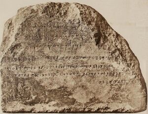 In Ugarit, Resheph’s name was written as ršp (𐎗𐎌𐎔) in the alphabetic script,[13] and it is variously vocalized by Ugartiologists as Rašp,[22] Rašap[23] or Resheph.[24] The writings Ra-ši-ip and Re-ša-ip appear in texts in standard syllabic cuneiform.[13] Logographic ones are also attested, many of them derived from the various forms of the theonym Nergal: dGÌR.UNU.GAL(.LA), dMAŠ.MAŠ and dKAL (=dLAMMA), though it is sometimes questioned if Resheph was necessarily meant in every case when they were used.[25] The use of logograms originally linked to Nergal to represent Resheph is also well attested in texts from Ekalte, with identified examples including dGÌR, dIGI and dMAŠ.TAB.BA.[26]