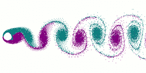 A vortex street around a cylinder. This can occur around cylinders and spheres, for any fluid, cylinder size, and fluid speed provided that it has a Reynolds number between roughly 40 and 1000.[1]