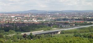 The Rhine–Main–Danube Canal (in the foreground, solid green) near Nuremberg