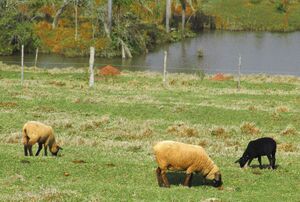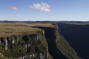 The northern part of the state lies on the southern slopes of the elevated plateau extending southward from São Paulo across the states of Paraná and Santa Catarina, and is much broken by low mountain ranges whose general direction across the trend of the slope gives them the appearance of escarpments. A range of low mountains extends southward from the Serra do Mar of Santa Catarina and crosses the state into Uruguay. West of this range is a vast grassy plain devoted principally to stock-raising – the northern and most elevated part being suitable in pasturage and climate for sheep, and the southern for cattle. East of it is a wide coastal zone only slightly elevated above the sea; within it are two great estuarine lagoons, the Lagoa dos Patos and Lagoa Mirim, which are separated from the ocean by two sandy, partially barren peninsulas. The coast is one great sand beach, broken only by the outlet of the two lakes, called the Rio Grande, which affords an entrance to navigable inland waters and several ports. There are two distinct river systems in Rio Grande do Sul – that of the eastern slope draining to the lagoons, and that of the Río de la Plata basin draining westward to the Uruguay River.[5]