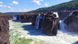 Fully one-third of the state belongs to the Río de la Plata drainage basin. Of the many streams flowing northward and westward to the Uruguay, the largest are the Ijuí of the plateau region, the Ibicuí, which has its source near Santa Maria in the central part of the state and flows westward to the Uruguay a short distance above Uruguaiana, and the Quaraí River which forms part of the boundary line with Uruguay. The Uruguay River itself is formed by the confluence of the Canoas and Pelotas rivers. The Pelotas, which has its source in the Serra do Mar on the Atlantic coast, and the Uruguay River forms the northern and western boundary line of the state down to the mouth of the Quaraí, on the Uruguayan frontier.[5]
