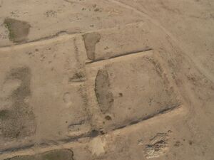 By far the most visible structure of the site is its centrally-placed fort. The fort is square in shape and has a rounded tower. It has two complexes and an outer wall covering an area of 2.25 hectares.[8] The joint Qatar Museums Authority-University of Wales Trinity Saint David Archaeological Mission ascribed three phases of construction to the fort.[9] Phase 1 marked the fort's original construction. It was likely deserted for a brief period of time before phase 2 witnessed the reconstruction of the fort, marking the peak of the fort's area. In phase 3, the fort was significantly downgraded.[10]