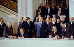 الرئيس الأمريكي ريتشارد نيكسون والأمين العام للحزب الشيوعي السوڤيتي ليونيد بريجنيڤ يوقعان معاهدة الحد من أنظمة الصواريخ المضادة للبالستية والمعاهدة المؤقتة للأسلحة الهجومية الاستراتيجية، في موسكو في 26 مايو 1972.