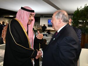 صباح الخالد الحمد الصباح مع الرئيس الأرميني أرمين سركيسيان خلال مؤتمر الأمم المتحدة لتغير المناخ 2021، نوفمبر 2021.