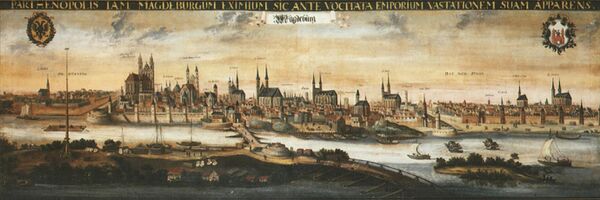 - ^ Born, Jakob H. (1742). Abhandlung von dem Stapel-Rechte der alten Stadt Magdeburg: worinnen zugleich einige Beweise desselben geprüfet, und die Befugniße der Stadt Leipzig in Ansehung der Stapel-Gerechtigkeit erörtert werden [Treatise on the staple rights of the old city of Magdeburg: wherein some evidence of the same is examined and the powers of the city of Leipzig in view of staple rights are discussed] (in الألمانية). Leipzig: Langenheim. p. 10.