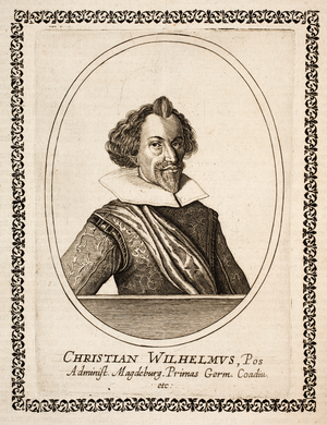 During the Thirty Years' War, Administrator Christian William entered into an alliance with Denmark.[9] In 1626, he led an army from Lower Saxony into the Battle of Dessau Bridge. After Wallenstein won this battle, Christian William fled abroad.[10] In 1629, he fled to the court of King Gustavus Adolphus of Sweden.[9]