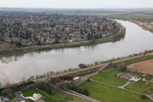 About 20 ميل (32 km) further downstream, the Sacramento River reaches the Tisdale Weir. During floods, water overtops the weir and flows east into the Sutter Bypass, the first of two major bypass channels that temporarily store and move floodwaters downstream to reduce pressure on the main channel of the Sacramento. The Sacramento River and the Sutter Bypass flow parallel for over 40 ميل (64 km), rejoining on the border of Sutter County and Yolo County near Knights Landing. The Feather River, the largest tributary of the Sacramento, joins from the east at Verona directly below the Sutter Bypass. A second flood control structure, the Fremont Weir, diverts flood waters from both the Sacramento and Feather Rivers into the Yolo Bypass, which parallels the Sacramento River down the west side of the valley. Cache Creek and Putah Creek, two major tributaries which formerly joined the Sacramento River from the west, are now intercepted by the Yolo Bypass via man-made channels.[10] The main channel of the Sacramento flows south, forming the Yolo–Sacramento County line.