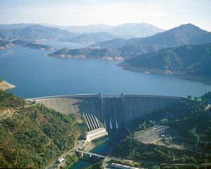 During the Great Depression in the 1930s, the first concrete proposals for a statewide water engineering project emerged, but when the state government could not sell the necessary bonds to fund the project, the federal government took over. The Central Valley Project, one of the largest irrigation projects in the world, was constructed by the U.S. Bureau of Reclamation beginning in 1935.[72][76] Ultimately, the system would distribute 7 million acre feet (8.6 km3) to irrigate 3 million acres (1.2 million ha) of land in the Sacramento and San Joaquin Valleys. Construction of Shasta Dam, the principal water storage facility in the Sacramento River system, started in 1938 and was completed in 1945. Controlling runoff from the upper 6،600 ميل مربع (17،000 km2) of the Sacramento River watershed, Shasta greatly reduces flood peaks on the middle and lower parts of the Sacramento River. Flood waters are stored for irrigation in dry years as well as navigation and electricity generation.[77][78] In the following decades, more huge reservoirs – capable of storing a combined 13×106 فدان-أقدام (16 km3) of water – were constructed on the Sacramento's main tributaries, enabling the regulation of water for irrigation and hydroelectric power.[73] Starting in the late 1950s, two major canals were extended to irrigate the western side of the Sacramento Valley – the Tehama-Colusa and Corning Canals. Starting at the Red Bluff Diversion Dam on the Sacramento, the canals are 111 mi (179 km) and 21 mi (34 km) long respectively, and divert a total of over 3،000 cubic feet per second (85 m3/s) of water to irrigate some 150،000 acre (610 km2).[79]
