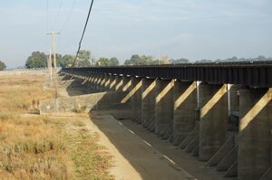 The Pit River, by far the largest of the three, begins in Modoc County in the northeastern corner of California. Draining a vast and remote volcanic highlands area, it flows southwest for nearly 300 ميل (480 km) before emptying into Shasta Lake near Montgomery Creek. Goose Lake, straddling the Oregon–California border, occasionally overflows into the Pit River during wet years, although this has not happened since 1881. The Goose Lake watershed is the only part of the Sacramento River basin extending into another state.[11] Unlike most California rivers, the Pit and the McCloud Rivers are predominantly spring-fed, ensuring a large and consistent flow in even the driest of summers.[11] At the lower end of Shasta Lake is Shasta Dam, which impounds the Sacramento River for flood control, irrigation and hydropower generation. Before the construction of Shasta Dam, the McCloud River emptied into the Pit River, which joined the Sacramento near the former mining town of Kennett, submerged when Shasta Lake was filled. The Pit River Bridge, which carries Interstate 5 and the Union Pacific Railroad over the reservoir, is structurally the highest double-decked bridge in the United States (although most of the bridge piers are submerged under Shasta Lake when the reservoir is full).[12] The Upper Sacramento River canyon also provides the route for I-5 and the railroad between Lakehead and Mount Shasta.[10]