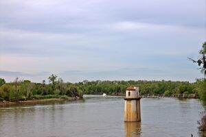 As the river continues south it approaches the Sacramento metro area, the largest population center in the watershed. Sacramento International Airport is located on the east bank of the river near Fremont. Near downtown Sacramento it receives the American River from the east, then passes under the historic Tower Bridge and Interstate 80 Business. The California State Capitol sits less than half a mile (0.8 km) east of the river where the Tower Bridge crosses it. Shortly downstream, the Port of Sacramento is located on the west side of the Sacramento, connected to the river by a lock. The Sacramento River Deep Water Ship Channel provides access to the port from the Pacific, bypassing about 42 ميل (68 km) of the winding lower Sacramento. The channel runs parallel to the Sacramento several miles to the west, and also forms the eastern boundary of the Yolo Bypass.[10] The manually operated Sacramento Weir, located across from downtown Sacramento on the west side of the river, serves to relieve floodwater pressure from the American River by allowing it to drain west into the Yolo Bypass instead of continuing down the Sacramento River.