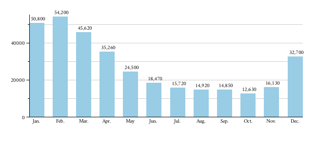 Monthly combined discharge of Sacramento River at Freeport and Yolo Bypass near Woodland (cfs)[22][23]