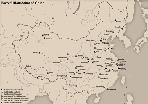 The Five Great Mountains or Wuyue are arranged according to the five cardinal directions of Chinese geomancy, which includes the center as a direction. The grouping of the five mountains appeared during the Warring States period (475 BC – 221 BC),[3] and the term Wuyue ("Five Summits") was made popular during the reign of Emperor Wudi of the Western Han Dynasty 140-87 BC.[1] In Chinese traditional religion they have cosmological and theological significance as the representation, on the physical plane of earth, of the ordered world emanating from the God of Heaven (Tian–Shangdi), inscribing the Chinese territory as a tán (壇; 'altar'), the Chinese concept equivalent of the Indian mandala.