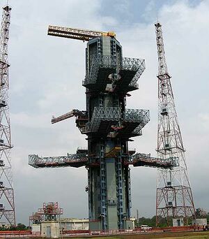 The Polar Satellite Launch Vehicle launch complex was commissioned during 1990. It has a 3,450 tonne,[11] 76.5 m high Mobile Service Tower (MST) which provides the SP-3 payload clean room. The solid propellant motors for the PSLV are processed by SHAR, which also carries out launch operations. The first launch of the PSLV took place on 20 September 1993.[12]