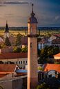A royal free city since the 13th century, Satu Mare changed hands several times in the 15th century until the Báthory family took possession of the citadel in 1526,[10] proceeding to divert the Someș's waters in order to defend the southern part of the citadel; thus, the fortress remained on an island linked to the main roads by three bridges over the Someș. In 1562 the citadel was besieged by Ottoman armies led by Pargalı İbrahim Pasha of Buda and Maleoci Pasha of Timișoara. Then the Habsburgs besieged it, leading the fleeing Transylvanian armies to set it on fire. The Austrian general Lazar Schwendi ordered the citadel to be rebuilt after the plans of Italian architect Ottavio Baldigara; using an Italian system of fortifications, the new structure would be pentagonal with five towers.[9] After a period when it changed hands, the town came under Ottoman control in 1661. Called Sokmar by the new authorities, it was a kaza center within the Şenköy sanjak of Varat Eyalet. This status held until 1691, when the army of the Habsburgs expelled the Ottomans during the Great Turkish War.[11] In the Middle Ages, Satu Mare and Mintiu were two distinct entities.[9] The two settlements, then called "Szatmár" and "Németi", were united in 1715, and the resulting city was named "Szatmár-Németi".[12][13] On 2 January 1721, Emperor Charles VI recognised the union, at the same time granting Satu Mare the status of royal free city.[9] A decade earlier, the Treaty of Szatmár was signed in the city, ending Rákóczi's War for Independence.[14]