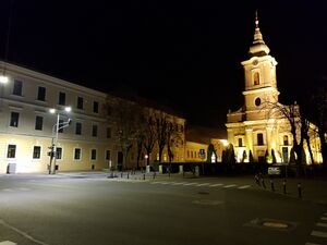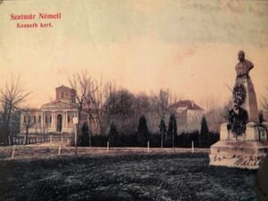The city's importance was linked to the transportation and commerce of salt from nearby Ocna Dejului (مجرية: Désakna, ألمانية: Salzdorf), possibly already at a very early date.[6] Due to the economic and commercial benefits it began to receive in the 13th century, Satu Mare became an important centre for craft guilds. In the 18th century, intense urbanisation began; several buildings survive from that period, including the old city hall, the inn, a barracks, the Greek Catholic church and the Reformed church. A Roman Catholic diocese was established there in 1804. In 1823, the city's systematization commission was established in order to direct its local government. In 1844, paving operations begun in 1805 were stepped up. The first industrial concerns also opened, including the steam mill, the brick factory, the Neuschloss Factory for wood products, the lumber factory, the Princz Factory and the Unio Factory. Due to its location at the intersection of commercial roads, Szatmárnémeti became an important rail hub. The line to Nagykároly (Carei) was built in 1871, followed in 1872 by a line to Máramarossziget (Sighetu Marmației) line, an 1894 link to Nagybánya (Baia Mare), 1900 to Erdőd (Ardud) and 1906 to Bikszád (Bixad).[9]