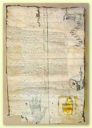 In addition to using a signet ring to seal documents, Muhammad may have also used other techniques to show the provenance of his correspondence. In an alleged letter to the Saint Catherine's Monastery in Egypt, he signed the letter, also called the Ashtiname of Muhammad, by inking his hand and pressing the impression on the paper. The letter granted protection and privileges to the monastery. In part it says: "I shall exempt them from that which may disturb them; of the burdens which are paid by others as an oath of allegiance. They must not give anything of their income but that which pleases them—they must not be offended, or disturbed, or coerced or compelled. Their judges should not be changed or prevented from accomplishing their offices, nor the monks disturbed in exercising their religious order, or the people of seclusion be stopped from dwelling in their cells. No one is allowed to plunder these Christians, or destroy or spoil any of their churches, or houses of worship, or take any of the things contained within these houses and bring it to the houses of Islam. And he who takes away anything therefrom, will be one who has corrupted the oath of God, and, in truth, disobeyed His Messenger." It is sealed with an imprint representing Muhammad's hand.[11]