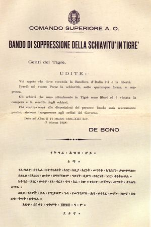 Italian notice, signed by general Emilio De Bono, proclaiming the abolishment of slavery in Tigray in Italian and Amharic. The abolition of slavery was one of the first measures taken by the Italian colonial government in Ethiopia.