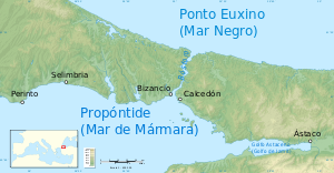 خريطة تبين موقع سليمبريا ومدن أخرى بالقرب من البسفور.